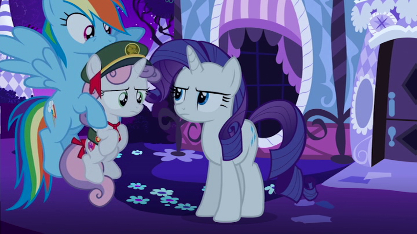 We start with Scoots helping some filly outside in a sand pit while Sweetie and Apple Bloom are in a meeting with the filly's parents who are consulting them on a cutie mark problem. Seeing these grown-ups having a formal meeting with the fillies is pretty goofy.